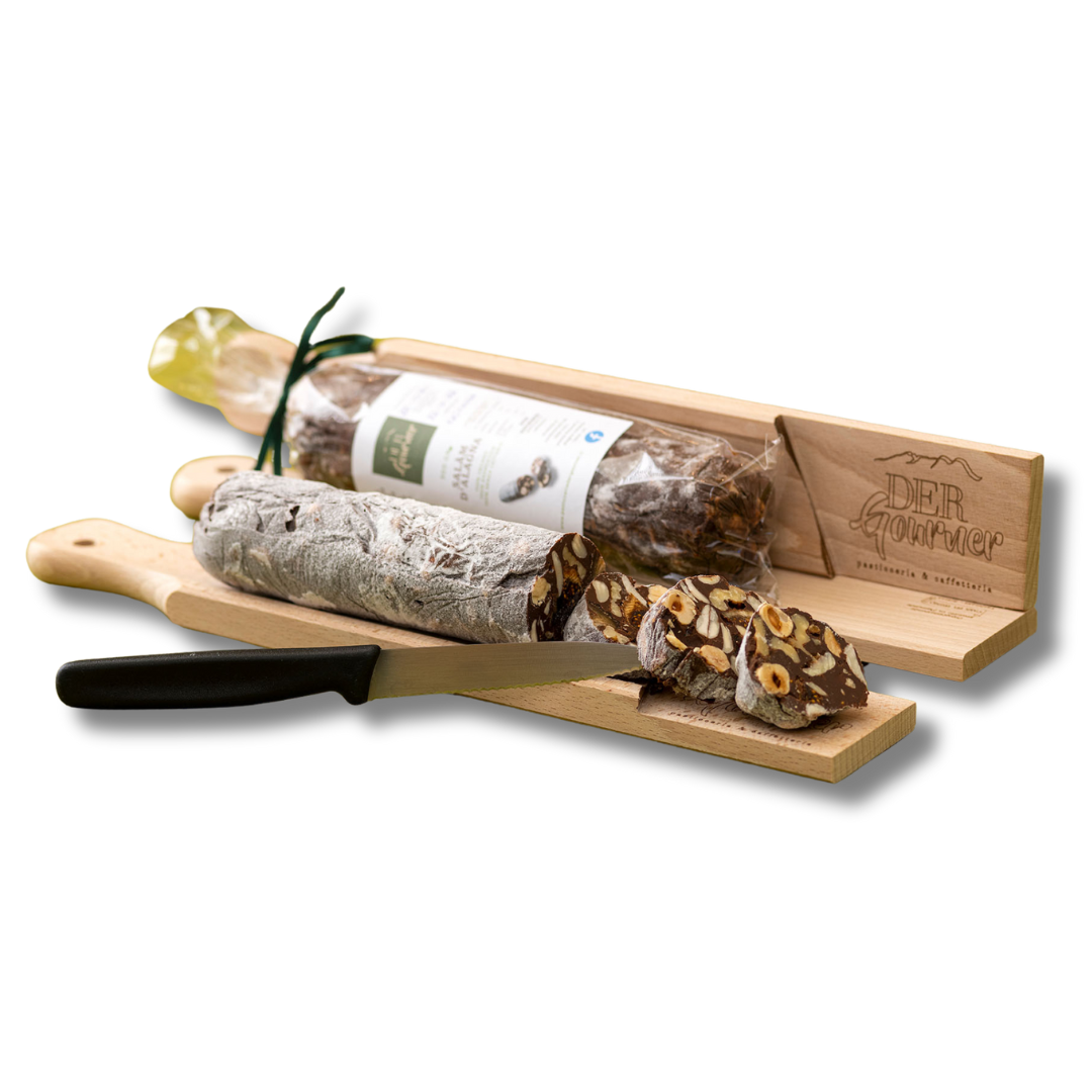 A modern, plant-based twist on the classic chocolate salami: vegan, gluten-free, packed with nuts, cocoa and natural sweetness from dates and figs. The decorative sugar gives it the charming appearance of an aged salami, but the first bite reveals a soft, rich, irresistible heart.